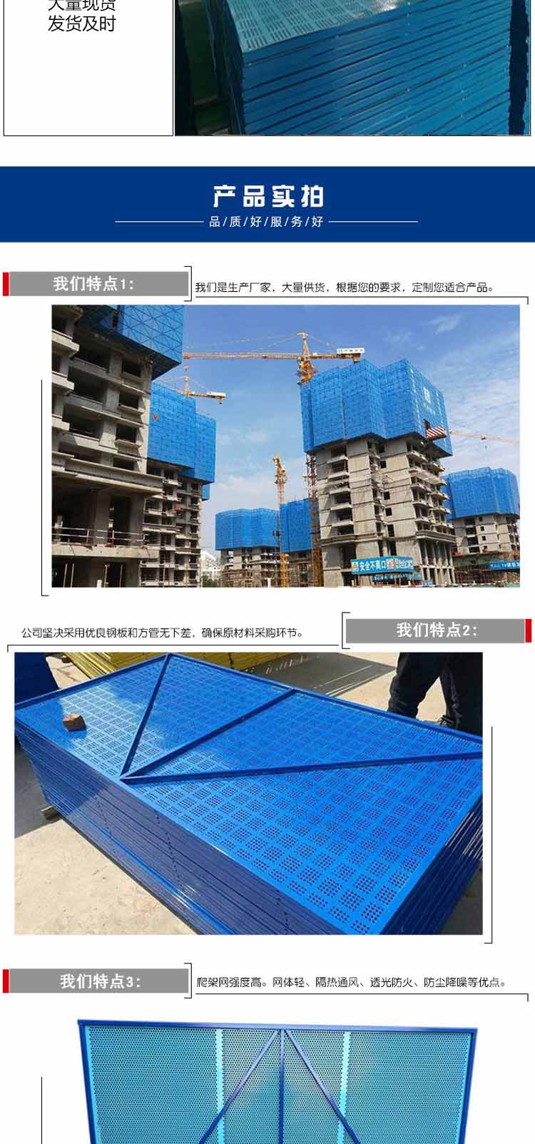爬架網(wǎng)片重量輕,方便安裝。顏色多種,常用顏色有藍(lán)色,……