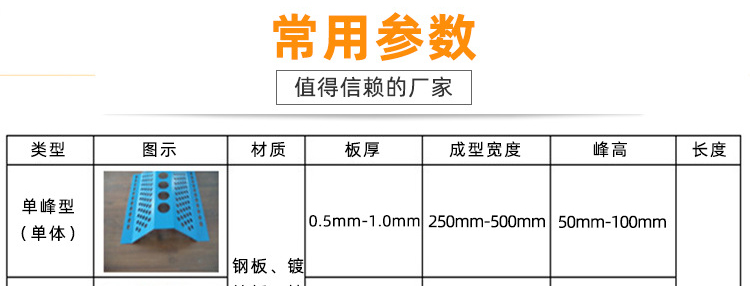成型寬度在250mm--500mm之間,峰高50mm--100mm,長度在6米之內(nèi)都可以加工。板材厚度0.5mm--1.5mm,在以上范圍之內(nèi),可以根據(jù)客戶的要求進(jìn)行加工制作。